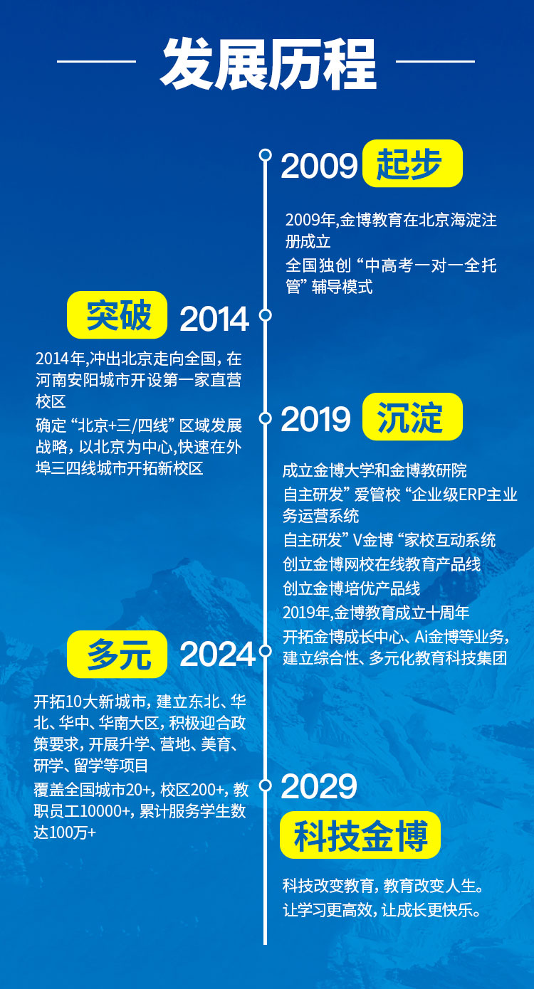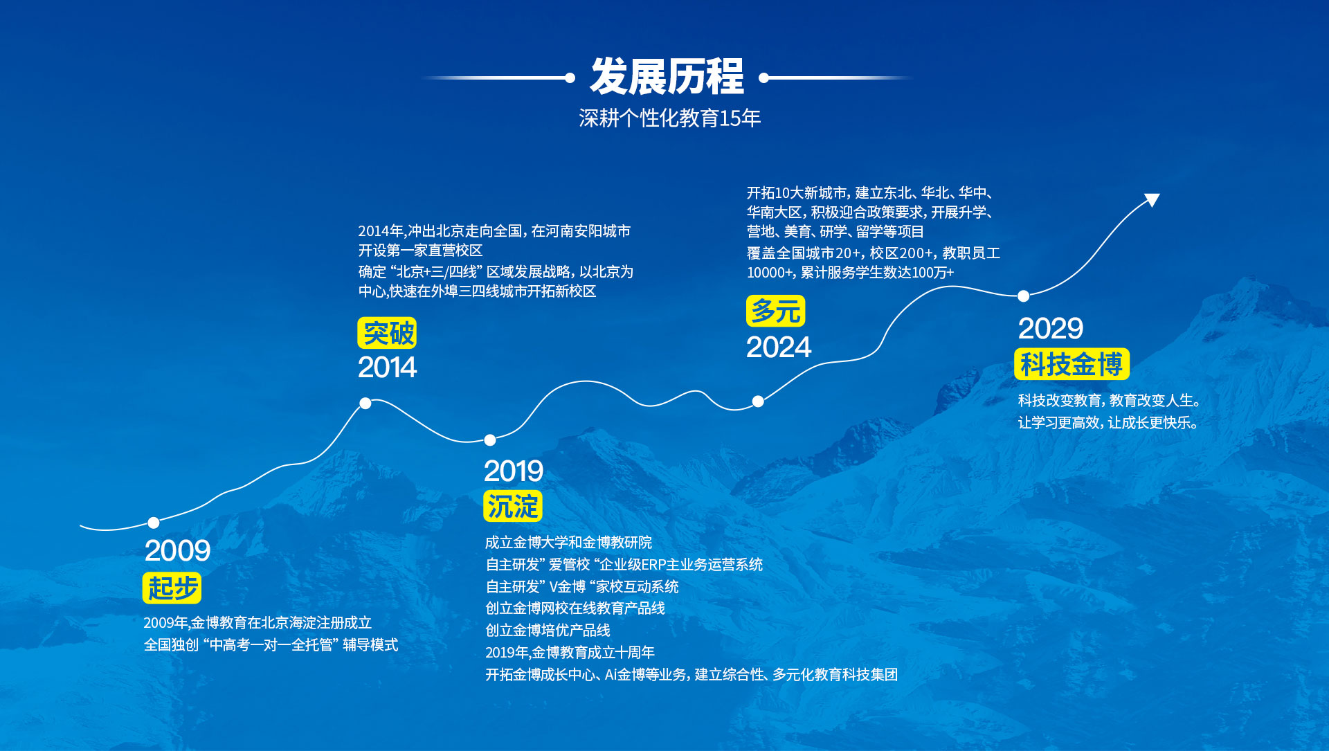 金博教育由张向涛先生于2009年创立,核心管理团队汇聚华为资深管理精英与清华大学、北京大学及武汉大学教育专家,是一家集教育咨询、教育产品研发、教育服务为一体,专注于青少年成长的综合性教育科技集团。集团旗下包含金博个性化、金博全日制、金博培优、金博网校、V金博、金博成长中心、AI金博等子品牌。